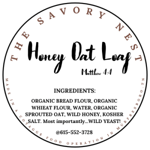 Ingredients: Organic Bread Flour, Organic Wheat Flour, Water, Organic Sprouted Oat, Wild Honey, Kosher Salt, Wild Yeast